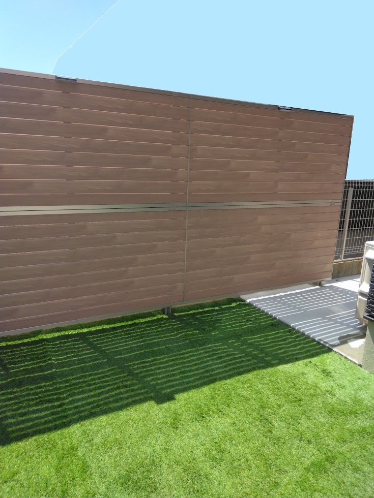 木調色のフェンスと人工芝の緑が映えてとても素敵なお庭になりました。